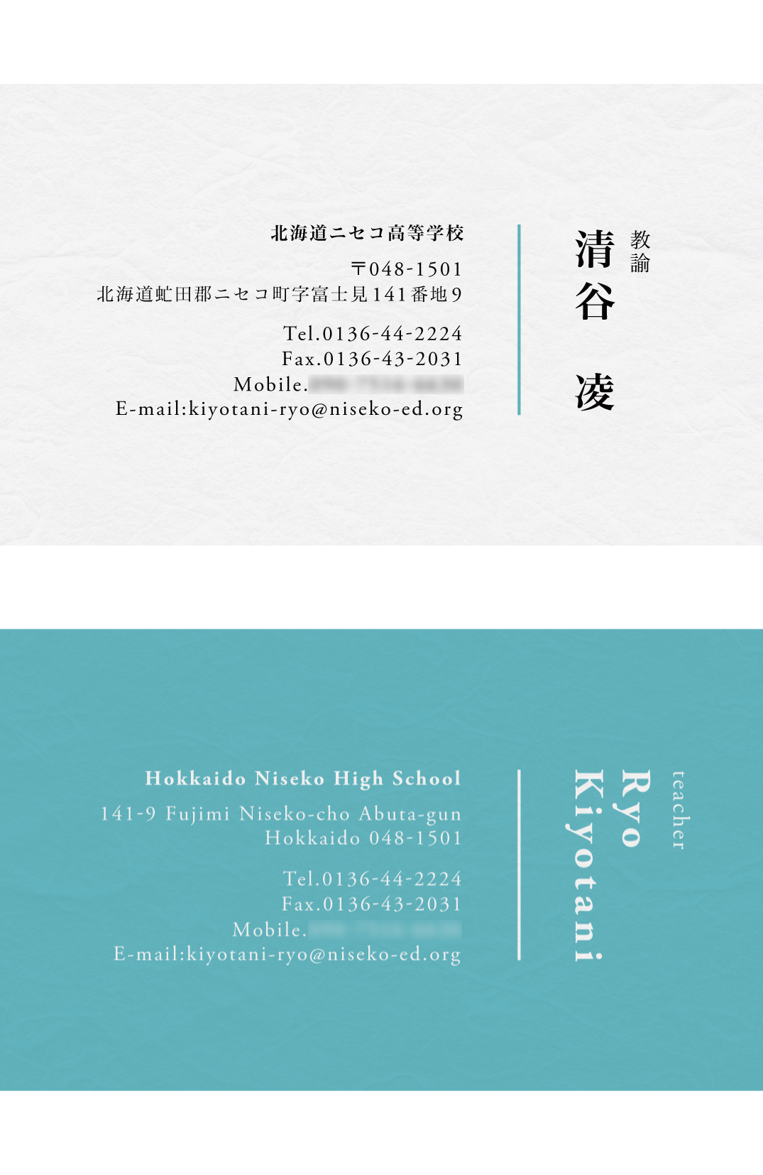 国語=和風を意識したデザインにするため、両面に和紙のテクスチャを使用。和文、欧文ともに品のあるフォントを選定することで、教師としての堅実さを表現。配色については、クライアントからブルーグリーンという希望があり、そこから日本の伝統色である新橋色を用いた。外国の方に名刺を渡す機会が多いため、裏面は欧文のみのデザインに。